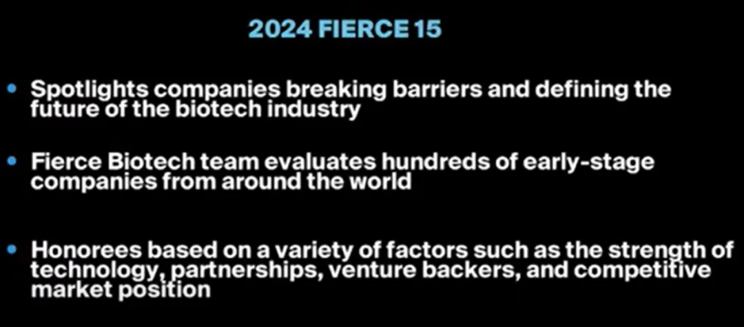 所以,对于初创Biotech而言,入选Fierce 15榜单是一种荣誉,更是对其在技术创新、商业模式以及市场潜力的一种肯定。