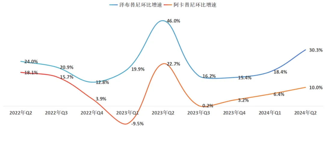 图:泽布替尼与阿卡替尼环比增速对比,来源:锦缎研究院