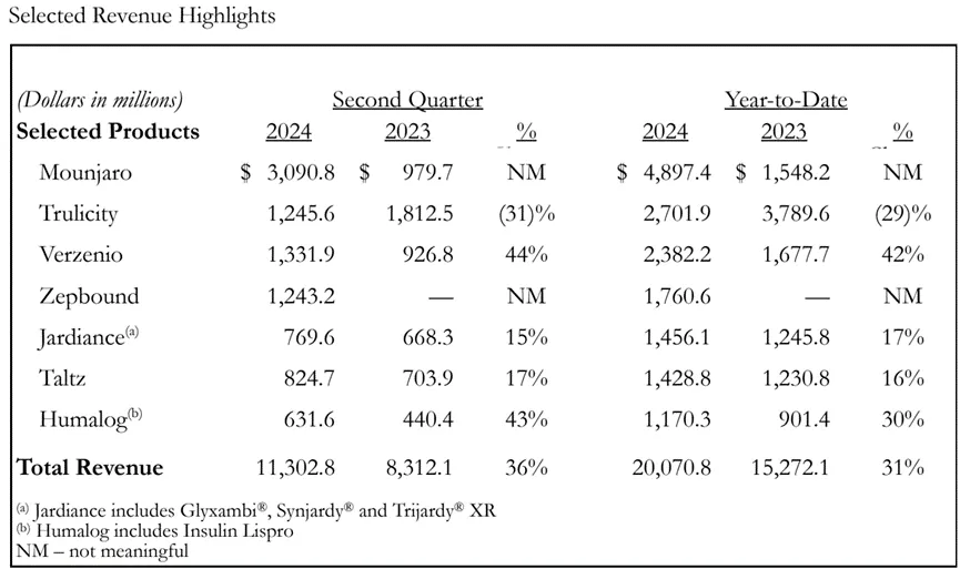 其中,重磅产品Mouniaro(tirzepatide降糖版)H1销售额达48.963亿美元。Zepbound(tirzepatide减重版)H1销售额达到17.606亿美元。两款产品在2024年的上半年总销售额达到了66.56亿美元,同比增长329%,受此消息影响公司股票盘前大涨9.5%。