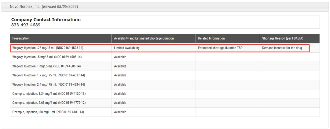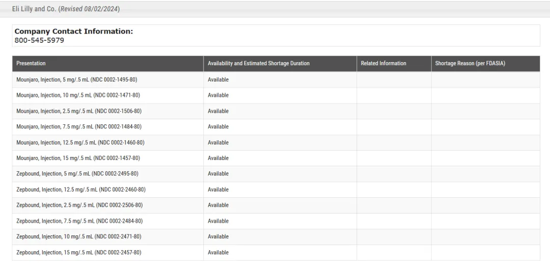 8月2日,礼来CEO表示,Zepbound(替尔泊肽减重版)在美国的持续短缺预计将在未来几天正式结束。8月9日,FDA官网显示礼来tirzepatide所有剂量均已不再短缺,充足的供应有望为其带来新的销售额增长。而Novo的semaglutide仍然短缺。据 FDA 网站,三剂 Wegovy 的“供应有限”,且没有指定解决短缺问题的日期。