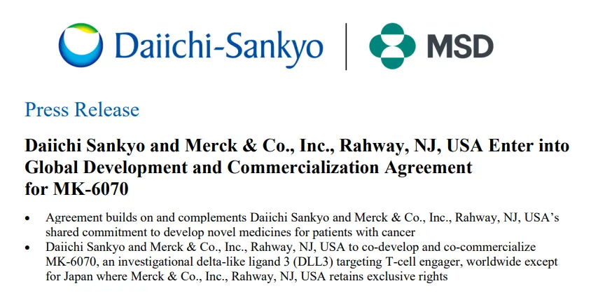 2024年8月,默沙东与第一三共宣布将共同开发及商业化MK-6070,默沙东仅保留了日本权益。