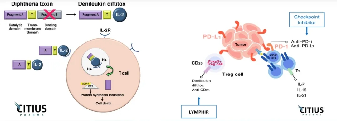 Lymphir是一款由IL-2和白喉毒素(diphtheria toxin)组合在一起的重组融合蛋白,它与细胞表面的IL-2受体相结合,导致白喉毒素片段进入细胞抑制蛋白合成。这一独特的作用机制让它可以同时靶向恶性T细胞和具有免疫抑制作用的调节性T细胞(Tregs)。暂时消灭Tregs具有增强患者免疫系统抗癌免疫反应的潜力。