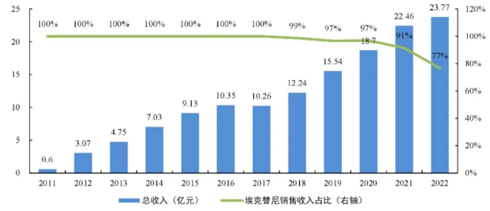 在2021年及2022年,贝达药业的埃克替尼仍然贡献了约91%和77%的收入。