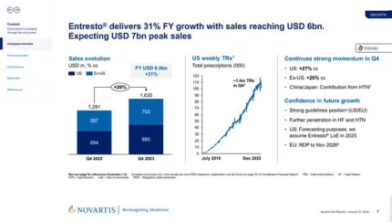 作为一款心衰和高血压治疗领域的突破性创新药,诺欣妥的销售额在过去几年中表现出色,迅速成为推动诺华销售增长的“重磅炸弹”产品。2023年的销售额达到了60.35亿美元,同比增长31%,成为诺华最畅销的产品;在2023年的财务报告中,诺华对诺欣妥的市场潜力持续看好,预测其销售峰值有望达到70亿美元。