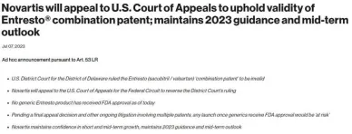 事实上,这已不是诺华首次捍卫Entresto专利的行动。在2023年7月7日,诺华曾面临另一项挑战,当时Entresto的组合专利被特拉华州法院判定无效。对此,诺华表示将上诉至美国联邦巡回上诉法院(CAFC),力图逆转这一不利判决。