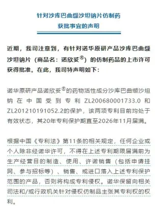 对此,诺华公司立即官方发表声明:沙库巴曲缬沙坦钠的两项专利目前均处于有效状态。