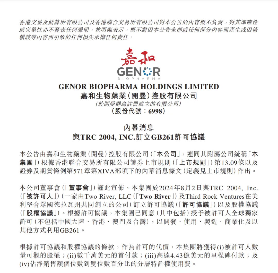 近日,嘉和生物宣布了一项重大的全球授权协议,将其旗下CD3/CD20双抗GB261的大中华区外全球权益授权给TRC 2004公司。根据协议,嘉和生物将获得一系列重要权益,包括“数量可观的股权、数千万美元预付款、4.43亿美元里程碑金额,以及个位数至双位数比例的销售分成”。这一协议不仅为嘉和生物带来了即时的资金支持,同时也确保了其在未来产品商业化成功后能够持续分享收益。