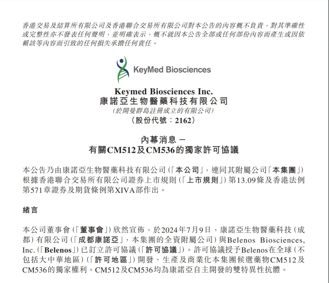 七月,康诺亚生物宣布了一项重大的全球授权协议,将其研发的两款双特异性抗体新药CM512和CM536的大中华区外全球权益授权给了Belenos Biosciences。根据这项协议,康诺亚将获得1500万美元的预付款和高达1.7亿美元的里程碑付款,以及基于销售的特许权使用费分成。此外,康诺亚的全资附属公司一桥香港将获得Belenos约30.01%的股权,从而在Belenos公司的未来发展中占有一席之地。