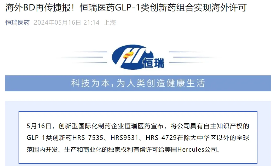 今年5月,恒瑞医药达成了一项重大的海外授权协议,将其GLP-1产品组合的全球权益(大中华区除外)授予了Hercules公司。作为交易的一部分,恒瑞医药不仅获得了一笔高达1.1亿美元的首付款和近期里程碑款项,而且还将获得最高可达60亿美元的临床开发、监管及销售里程碑款项,以及基于产品销售额的一定比例提成。此外,恒瑞医药还取得了Hercules公司19.9%的股权,这一战略性的股权投资使其成为Hercules公司的重要股东之一。