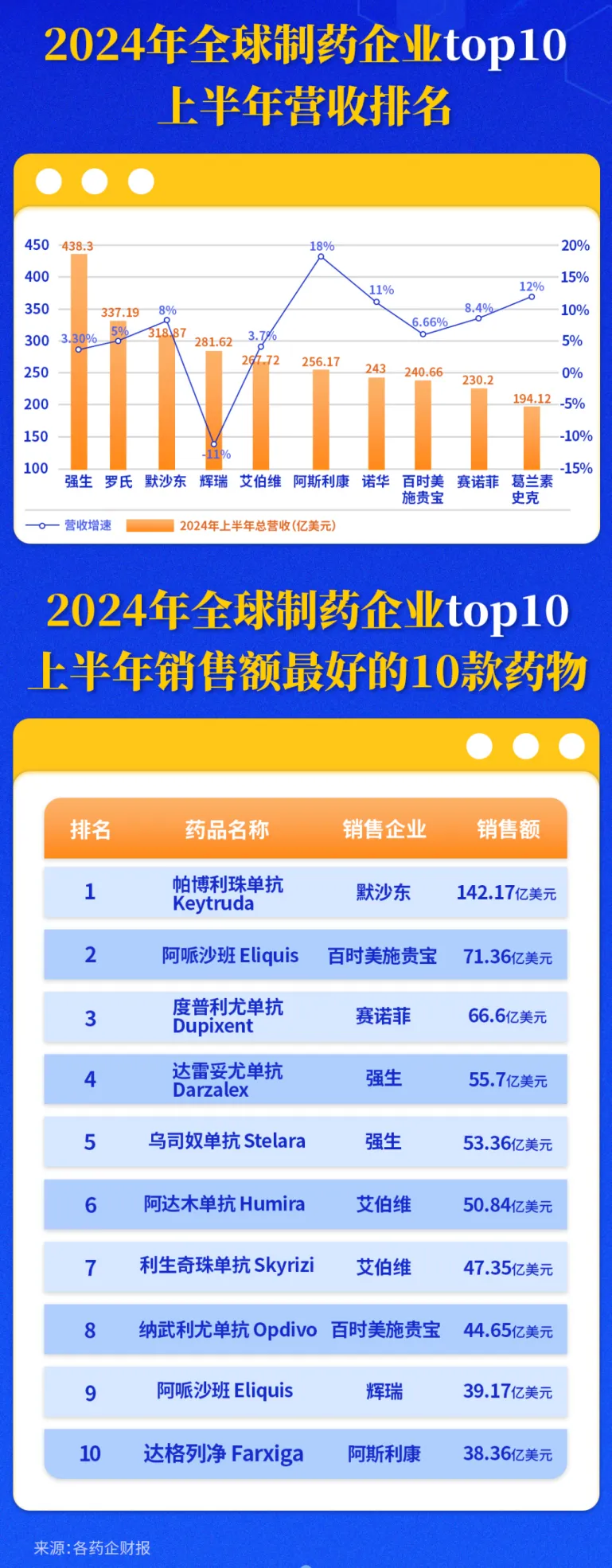 2024年上半年全球制药企业前十强的财务报告已经公布。