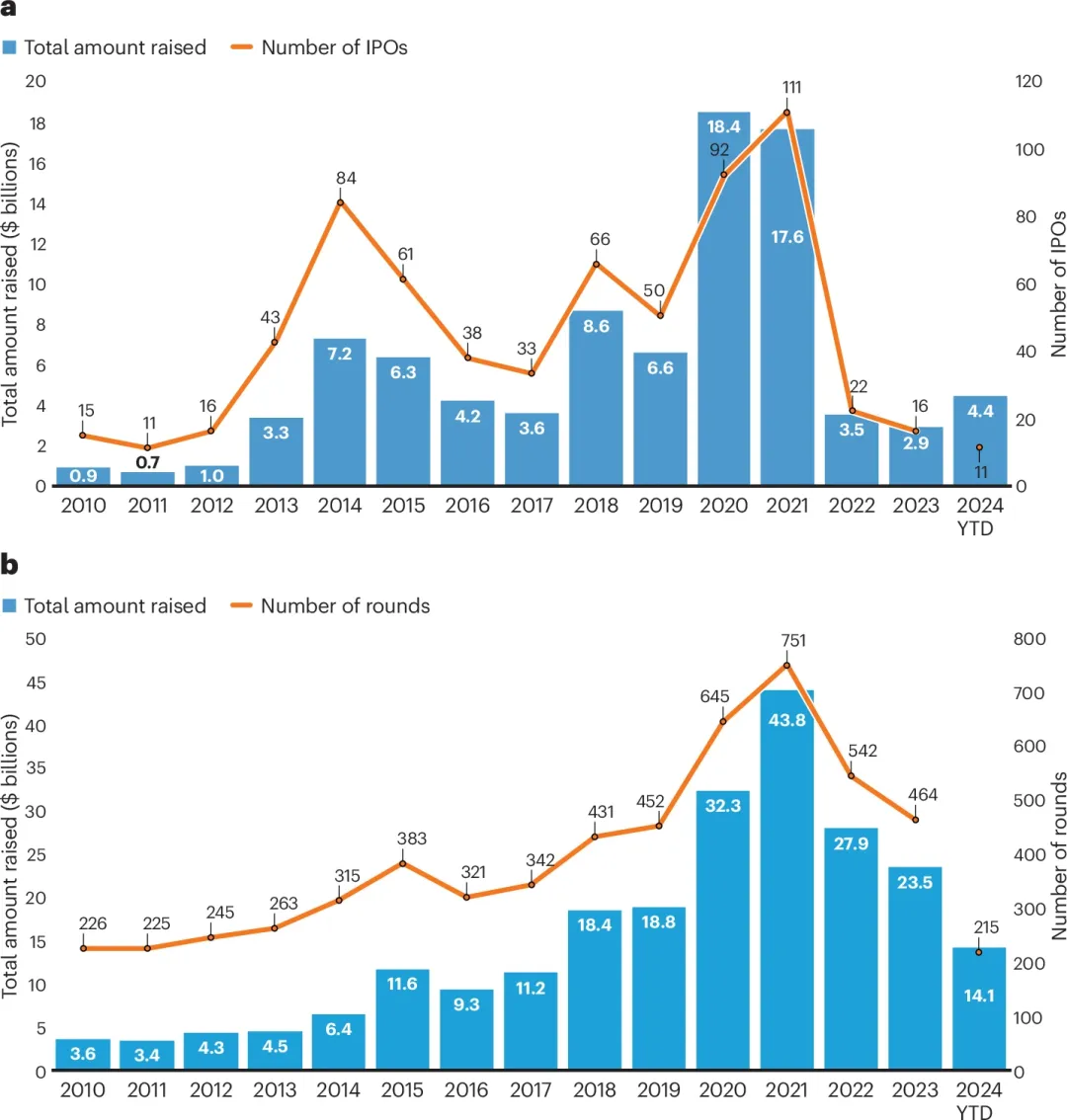 首先,黎明似乎不远了。2024年迄今为止,Biotech公司的 IPO 数量仍然很少,但筹资总额已经超过了2022年、2023年的总体水平。而且,2024年生物制药风险投资的总额有望超过新冠疫情大流行前,也就是2019年的水平。