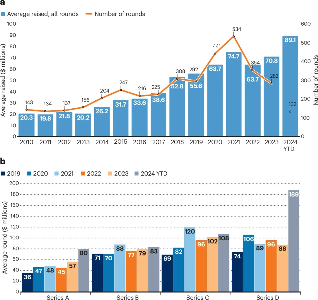 Biotech公司融资数量变少,但规模变大了。根据 Endpoints 的数据,2024年以来,拿到融资的Biotech公司平均每轮融资(不包括种子融资轮)接近9000万美元(图3a) ,今年迄今为止,至少有50家公司已经筹集了1亿美元的资金。