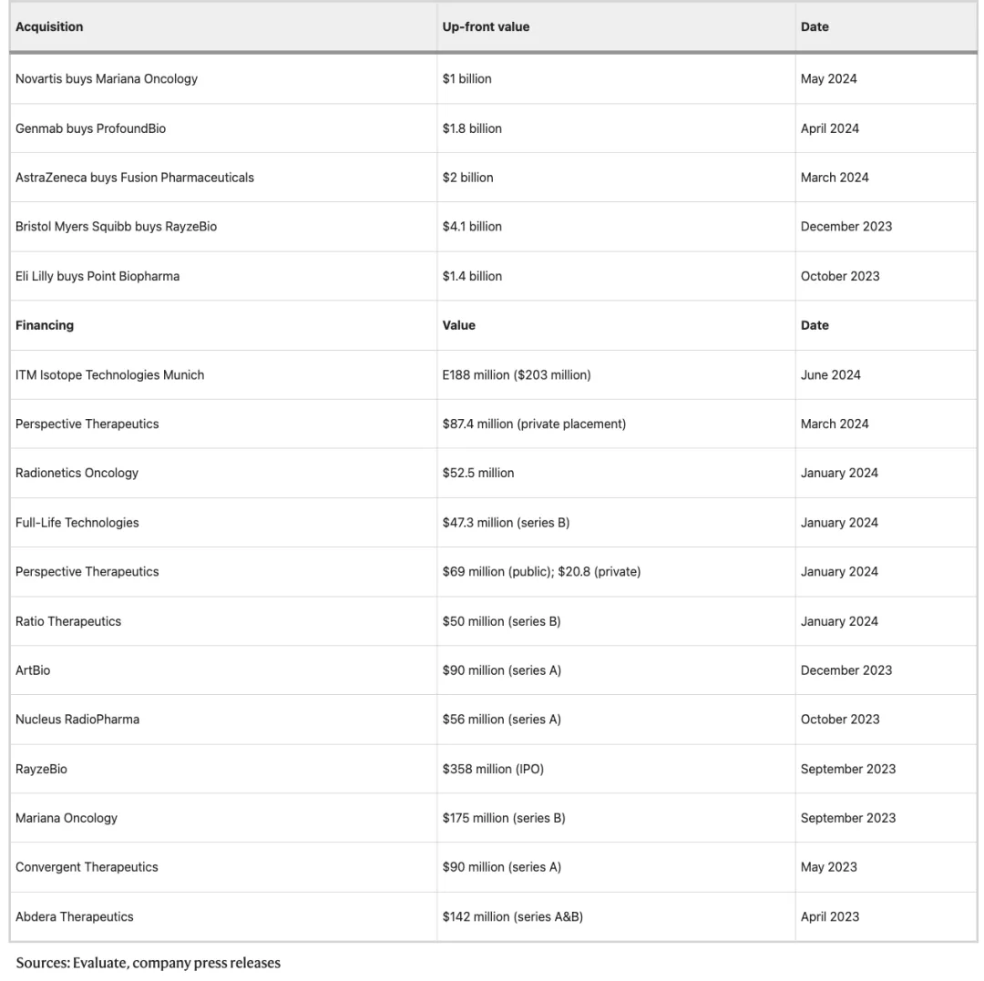 表1:2023-2024放射性配体疗法的交易和融资情况