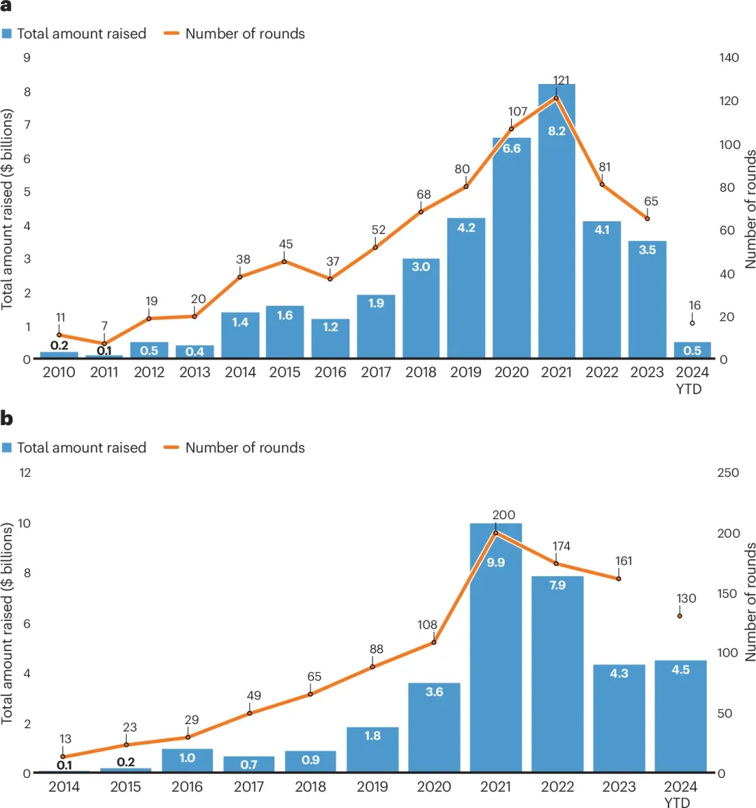 8月8日,《Nature Biotechnology》刊发的一篇专题文章分析了2024年生物技术公司投融资的变化。在进行多维度的投融资数据分析以及采访行业知名的投资人、创业者和企业家后,文章指出,2024年至今Biotech的投融资变化是显著的。