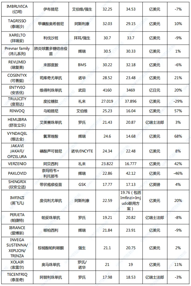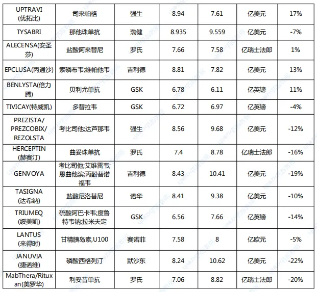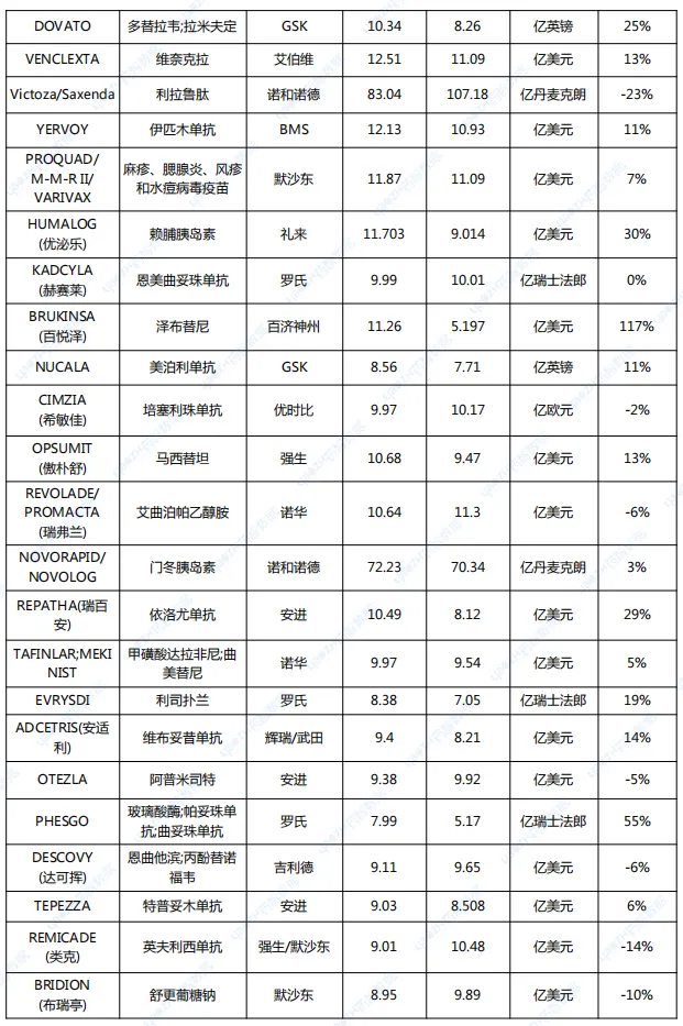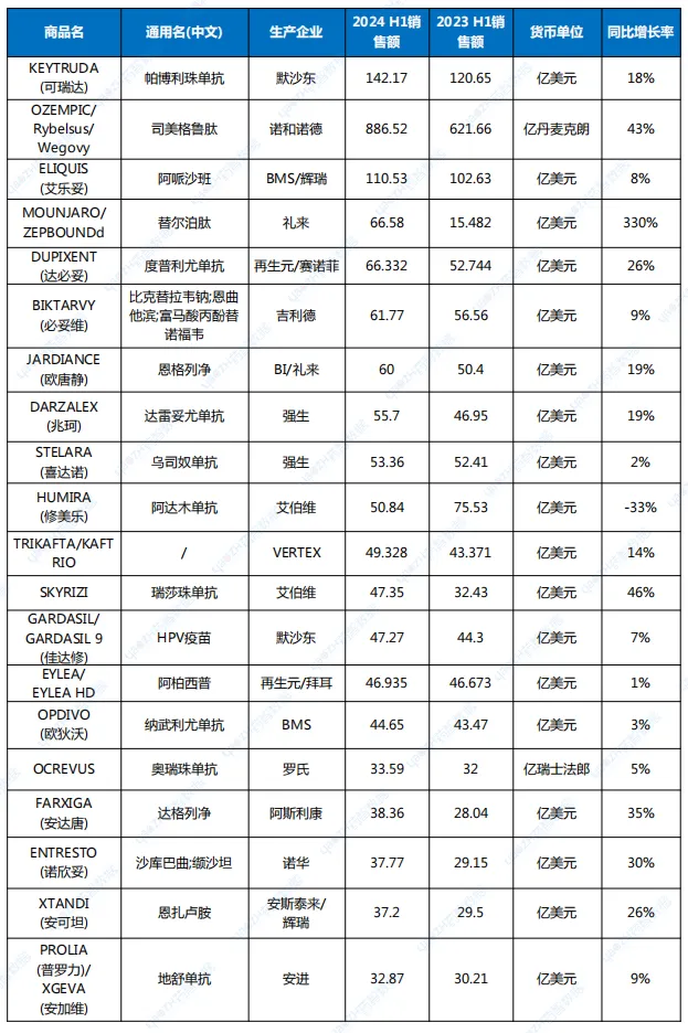 注:1.由于汇率影响,销售额以美元排序略有差异;2.由于勃林格殷格翰未披露2024上半年具体产品销售额,JARDIANCE(恩格列净)销售额为笔者预估值。
