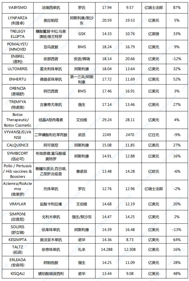 默沙东的K药在2023年销售额达到250亿美元,夺得“药王”宝座,今年上半年K药销售额继续实现两位数增长,达到142亿美元。排名前十的药物半年销售额均超过50亿美元,且其中一半还有两位数的同比增长率,未来仍有不少增长空间。