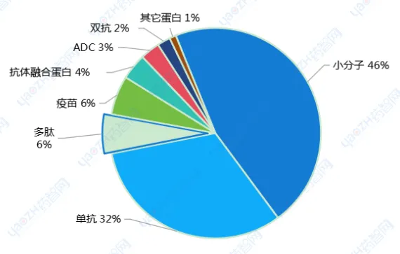 从药物类别来看,小分子(46%)和单抗(32%)是主要的药物类型,其次为多肽、疫苗,新型药物ADC、双抗也占有一定比例。