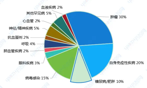 从适应症来看,肿瘤和自身免疫性疾病由于种类繁多,而某些药物具有普遍适用性,往往囊获多个甚至数十个适应症,因此容易诞生重磅药物。其次为抗感染、糖尿病和肥胖领域也有多个药物上榜。