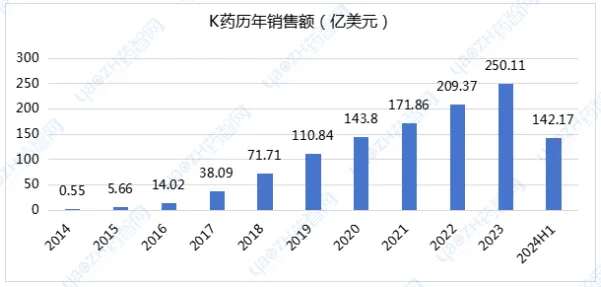 K药最早于2014年在美国批准上市,得益于适应症的不断拓展和联合疗法的开拓,该药上市十年销售额仍保持高速增长,2023年销售额250亿美元,同比增长19%;2024上半年K药销售额142.17亿美元,同比增长17.8%。