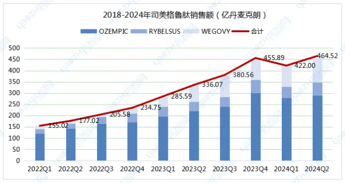 2023年这3个品牌合计销售额212亿美元,同比增长率近乎翻倍。2024年上半年司美格鲁肽销售额再次实现同比大增,达到130亿美元,距离药王K药的142亿美元,仅一步之遥。