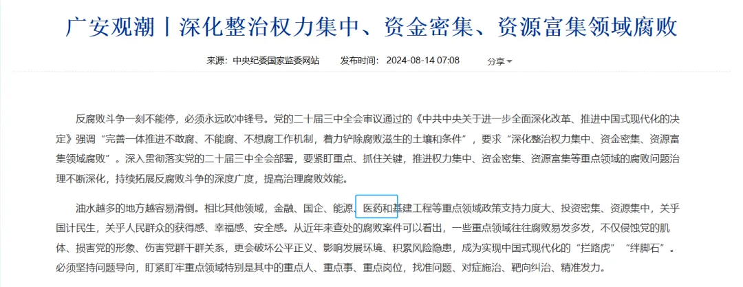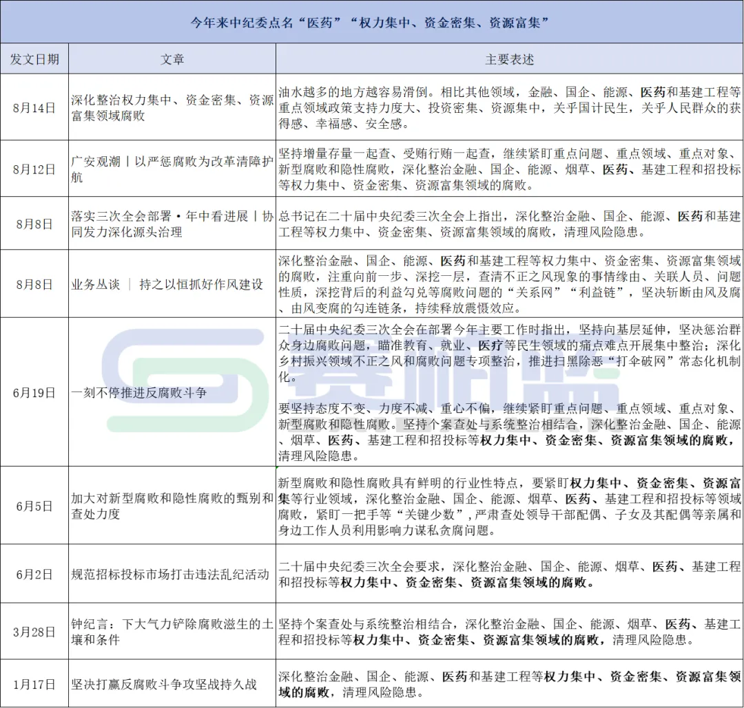 医药被归类于“权力集中、资金密集、资源富集领域”。截至目前,中纪委在今年至少8次点名医药腐败,仅8月,中纪委就4次点名医药腐败,并要求深化整治医药腐败。