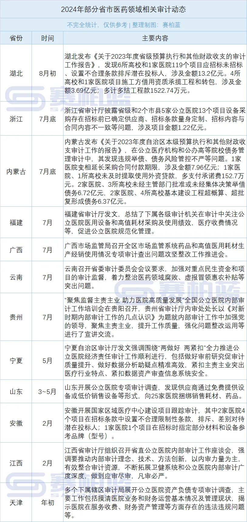 据赛柏蓝不完全统计,今年至少已有山东、浙江、安徽、湖北、福建、江西、内蒙古、宁夏、广西、贵州、云南、天津等12省加码医院审计工作(具体内容见文末表格)。