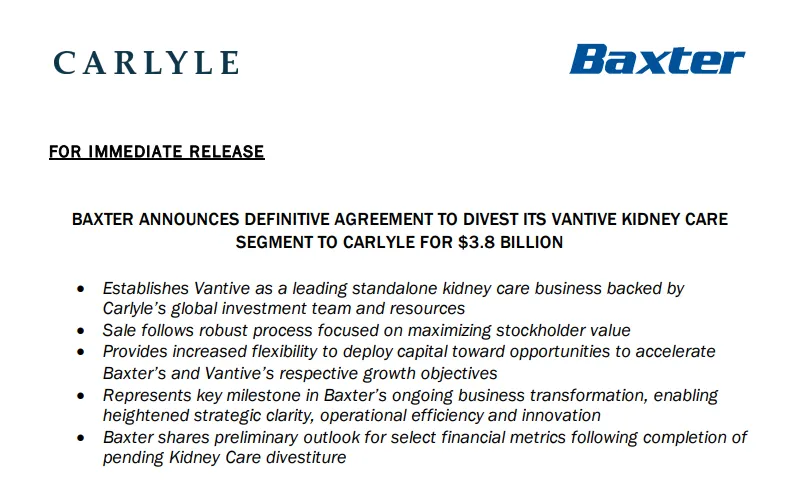 8月13日,百特(Baxter)宣布已与全球知名投资公司凯雷(Carlyle)达成收购协议,将其已有近70年历史的肾脏护理部门(Kidney Care)以38亿美元的总交易额出售给后者。根据最终协议的条款,在进行某些成交调整后,百特将获得约35亿美元的现金,目前估计税后净收益约为30亿美元。该交易预计将于2024年底或2025年初完成。