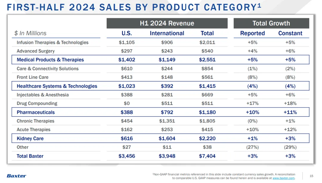根据百特财报,2023年其总营收为148.13亿美元,其中肾脏护理部门的收入为44.53亿美元,占总收入的30%。今年上半年,该部门的收入为22.20亿美元。