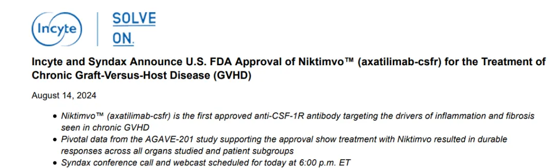 8月14日,Syndax Pharmaceuticals和Incyte共同宣布,FDA已经批准Niktimvo(axatilimab-csfr)上市,用于治疗慢性移植物抗宿主病(GVHD)。