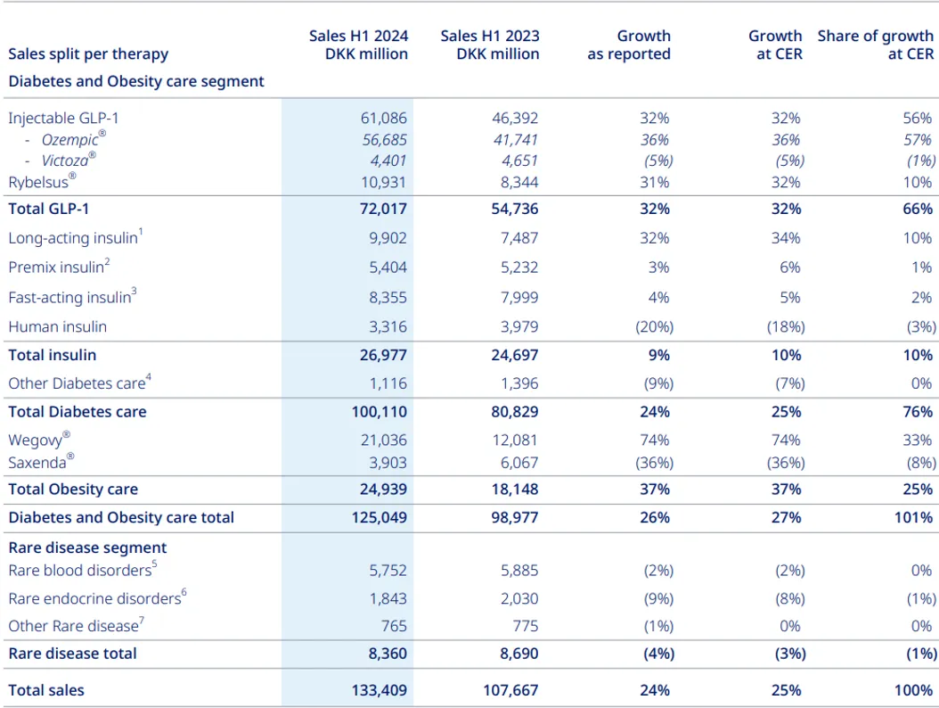 1.Novo Nordisk's sales increased by 24% in Danish kroner and by 25% at constant exchange rates to DKK 133.4 billion in the first six months of 2024