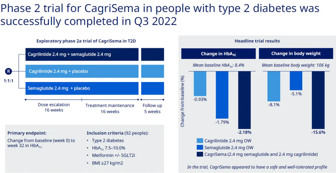 2022年8月,Novo公布了一项针对超重2型糖尿病患者的II期研究结果,显示 CagriSema可在32周内减轻15.6%的体重,而单独使用Wegovy可减少5.1%,单独使用cagrilintide可减轻8.1%(图2)。