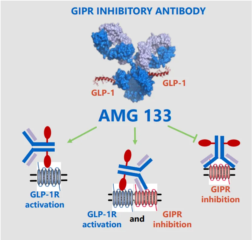 其中,GLP-1受体激动剂负责激活GLP-1受体,刺激胰岛素分泌,而抗GIP抗体负责下调GIP的分泌,两股力量协同在一起,从而实现可控的减肥目标。