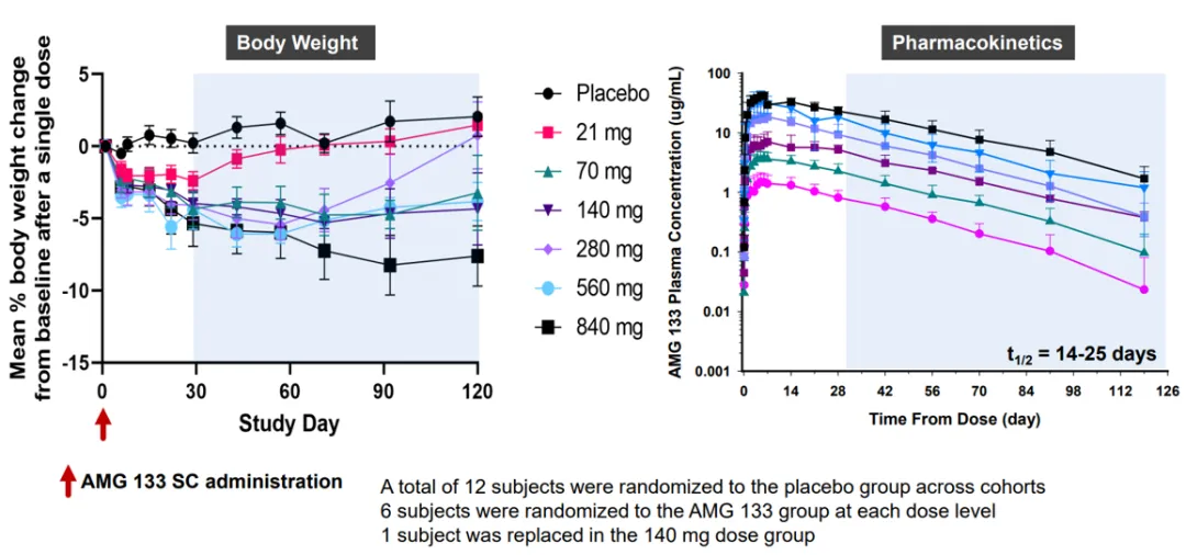 此前,MariTide在肥胖受试者中的一项随机、双盲、安慰剂对照的临床I期递增剂量显示积极的结果,显著降低患者体重(图4)。