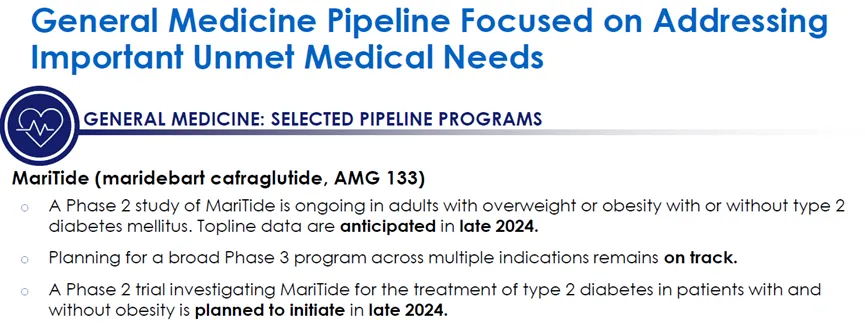 据安进2024年第二季度财报显示,MariTide的2期研究正在进行中,研究对象是有或没有2型糖尿病的超重或肥胖的成年人,预计2024年底将公布顶线数据;MariTide涵盖多个适应症的广泛3期项目的规划,仍在按计划进行以及一项研究 MariTide治疗2型糖尿病伴有或不伴有肥胖症的患者的2期试验,计划于2024年底启动(图5)[4]。
