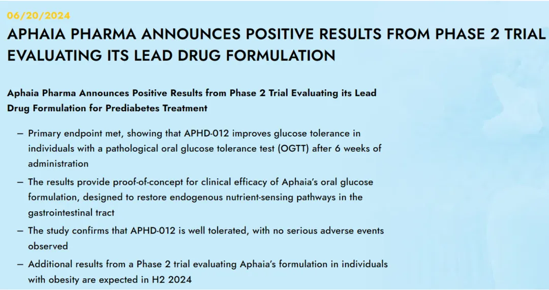 今年4月份,Aphaia宣布已完成APHD-012的一项随机、双盲、安慰剂对照,概念验证临床2期试验(NCT05385978)的注册,该试验评估了每日一次12g剂量的口服葡萄糖制剂(APHD-012)的安全性和有效性,以诱导肥胖患者减肥。