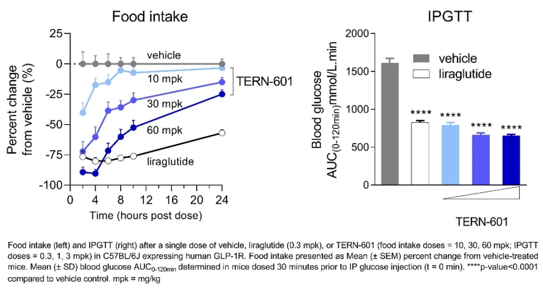 此前,TERN-601在临床前取得积极研究结果,在体外,TERN-601在稳定表达人 GLP-1R的CHO-K1细胞中有效刺激(EC50 = 2.9 ± 0.8 nM)细胞内cAMP生成,这是GLP-1R激活的下游结果。