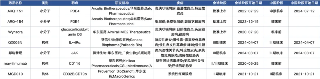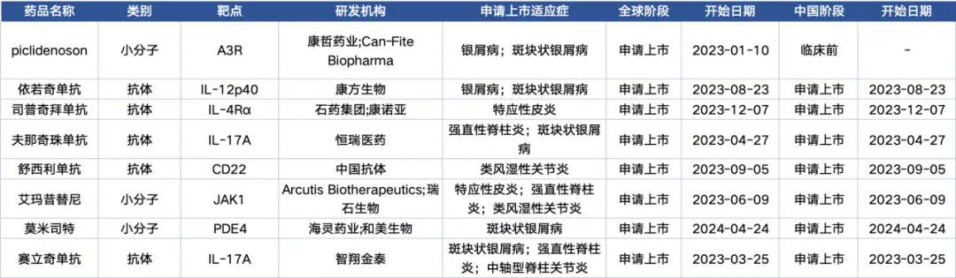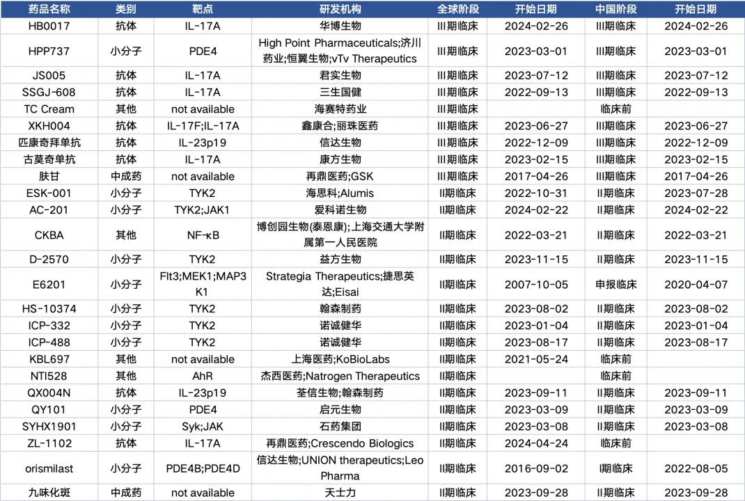 在6大适应症中,银屑病和类风湿性关节炎的研发最为活跃、进展最快,主要在研疗法集中在PDE4、IL-17、TYK2、JAK1等经过验证的靶点进行开发。