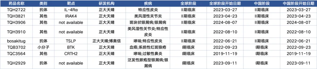 正大天晴在自免重点疾病领域约有8条临床在研管线,2期5条,1期3条。