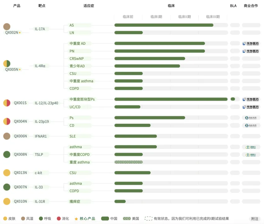 QX005N,是荃信生物自研的一款靶向IL-4Rα的创新型单抗,可同时抑制IL-4和IL-13介导的信号通路与生物学效应。2024年7月19日,华东医药全资子公司中美华东获得QX005N在大中华区地区的独家权益。目前,QX005N已在国内获得用于治疗成人中重度特应性皮炎、12-17岁青少年特应性皮炎、结节性痒疹、慢性鼻窦炎伴有鼻息肉、慢性自发性荨麻疹、哮喘及慢性阻塞性肺疾病的7项IND许可,是中国IL-4Rα靶向候选药物中适应症获得IND许可最多的产品。其中,针对成人中重度特应性皮炎、结节性痒疹2项适应症已处于3期临床。