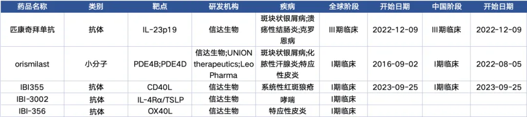 截止目前,信达生物共有5个自免管线进入临床,3期1个,1期4个。