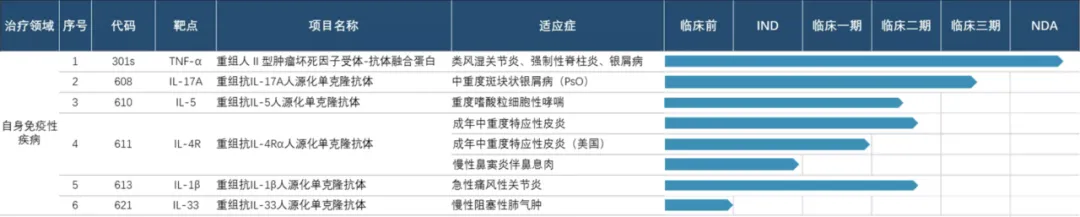 目前,三生国健进入临床的自免管线共有4条,其中在研的抗IL-17A人源化单克隆抗体(“608”)、抗IL-1β人源化单克隆抗体注射液(“613”)、抗白介素4受体alpha(IL-4Rα)的人源化单克隆抗体药物(“611”)部分适应症已进入3期临床。