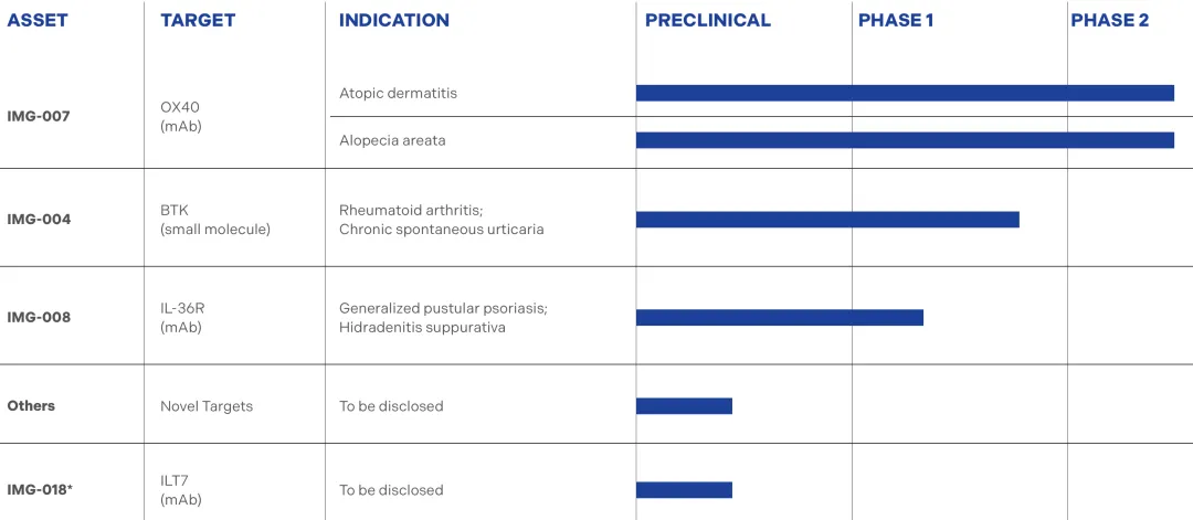 IMG-007,是目前全球唯一处于临床期、非耗竭性抗OX40的单克隆抗体,以独特的方式靶向OX40受体,不清除T细胞,并且半衰期长,具有同类最佳的潜力。IMG-007最初由和黄医药发现,创响负责从药物候选阶段进行全球开发至今,拥有IMG-007的全球权利的独家选择权。IMG-007在特应性皮炎患者中的临床2a期研究产生了积极的中期结果。该2a 期研究是一项评估IMG-007在外用药物控制不佳和/或不耐受的中重度特应性皮炎(AD)成人患者中的安全性,药代动力学和有效性的研究,预计在2024年第3季度获得最终结果。除AD适应症外,IMG-007正在开展在斑秃患者中的全球2a临床研究,其结果预计在2024年第4季度产生。