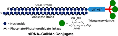 siRNA:RNA干扰(RNAi)是一种古老的生物机制,用于防御外部入侵。理论上,它可以以序列特异性的方式沉默任何与疾病相关的基因,使siRNA成为一种有前途的治疗方式。在没有保护性递送载体的情况下,siRNA必须进行化学修饰,以确保肠胃外给药后循环的稳定性。其是一类人工合成的双链短RNA分子,能够结合AGO蛋白组装成RNA诱导沉默复合体(RISC),其一条链被降解,另一条链通过碱基互补配对原则结合并切割降解靶基因的mRNA、 阻断靶蛋白的表达,从而达到治疗相关疾病的目的,其具有高度特异性。