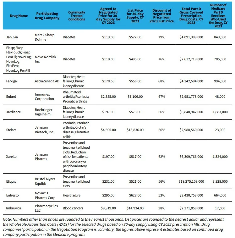 2024年8月15日,美国医疗保险和医疗补助服务中心(CMS)根据通胀削减法案(IRA)首批10款价格谈判的药物价格折扣已经确定,新的价格将从2026年1月1日起效。西格列汀(Januvia)降价79%、门冬胰岛素降价76%、达格列净降价68%、恩格列净降价66%,这4款药物均为长效降糖药。Enbrel(依那西普)降价67%、Stelara降价66%,这2款为自免药物。Xarelto(利伐沙班)降价62%、Eliquis(阿哌沙班)降价56%,这3款为心血管药物。Imbruvica(伊布替尼)降价38%,为唯一一款肿瘤药。