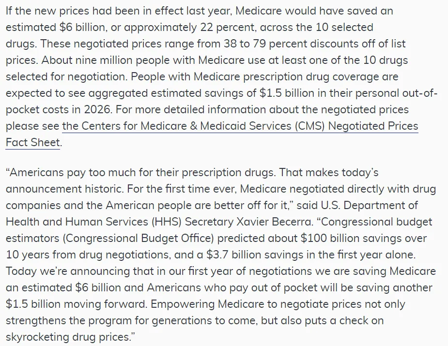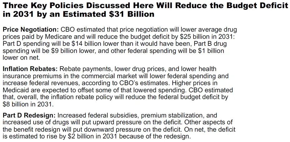 对于处方药价格谈判方案,IRA规定从2026年开始起效,限定范围是Part B和Part D中分别处于TOP50的畅销药(Medicare中Part B主要是医生进行注射的药物,Part D则主要是口服药以及患者自行注射的大分子药物,Part D的总体量远超Part B)。具体进程设定为2023年选定10个Part D(本次降价的10款)、2025年选定15个Part D、2026年选定15个Part B/D、2027年选定20个Part B/D,2023年选定的,2026年起效,2025年后选定的,选定后2年后起效。此外,IRA还涉及Part D的支付体系改革,以及通胀返点等,预计三者合计到2031年将削减310亿美元支出,其中处方药价格谈判预计将削减250亿美元支出。根据此次首批10款药物的折扣情况,拜登政府预计2026年首年可节省60亿美元支出。