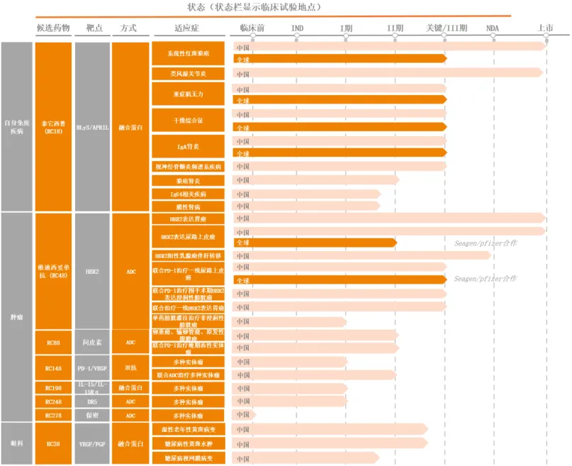 RC248是新型DR5靶向ADC,用于治疗多种实体瘤,目前正处于I期爬坡的研究阶段;RC278也是一种用于治疗多种实体瘤的新型ADC药物,目前尚处于临床前研究阶段,靶点处于保密状态。