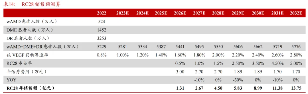 据浙商证券研报显示,2022年抗VEGF药物雷珠单抗、康柏西普、阿柏西普的样本医院销售额均达到3亿元以上,目前国内抗VEGF药物市场规模已超过40亿元,预计RC28三项适应症在2026-2028年获批上市,国内销售峰值将超过10亿元。