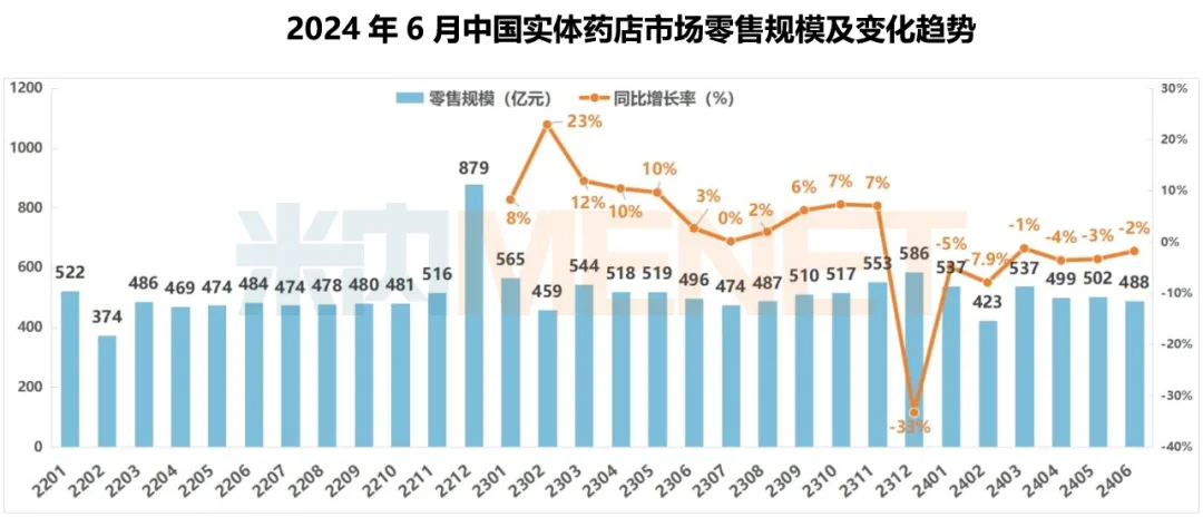 2024年1-6月中国实体药店的累计规模为2986亿元,较去年同期累计规模下滑了3.7%,人群消费意愿仍然低落。