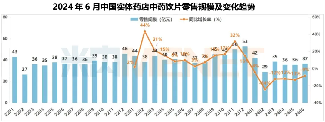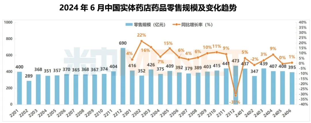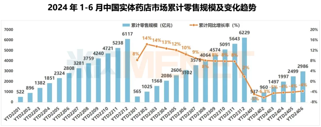 总体分析:2024年上半年中国实体药店零售规模(药品+非药)为2986亿元,同比下降3.7%