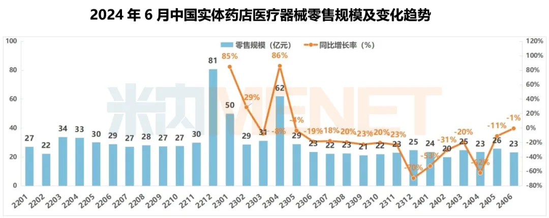 2024年6月,中国实体药店医疗器械零售规模为23亿元,比今年5月减少了2.4亿元;与去年同期相比,下降幅度明显收窄,只有0.7%的降幅。2024年1-6月,医疗器械累计规模为141亿元。
